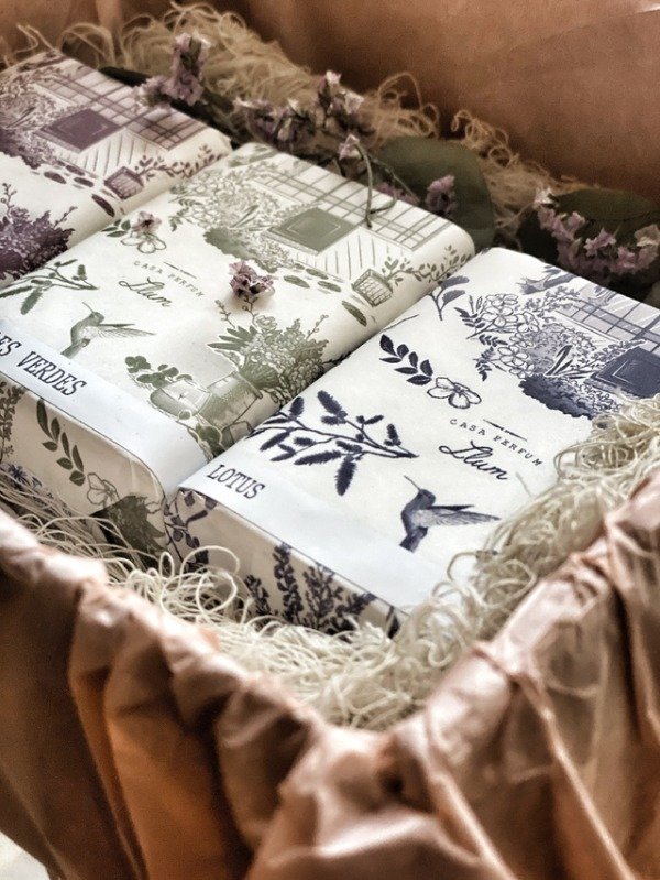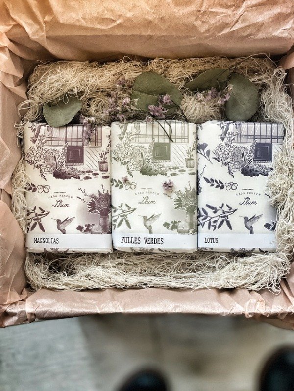 Caja para regalo que incluye 3 jabones aromatizados 100% naturales en pan de 200grs.