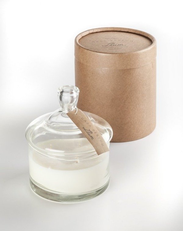 Vela de soja en cilindro de vidrio de 8,5 cm de alto x 13 cm de diámetro, 3 pabilos de algodón y tapa de vidrio.