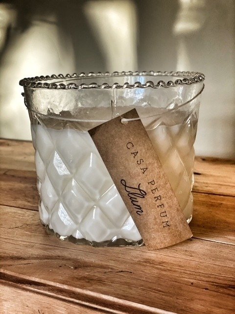 Vela de soja en florero labrado de vidrio 10 cm x 12 de diámetro y 1 pabilo de algodón.
